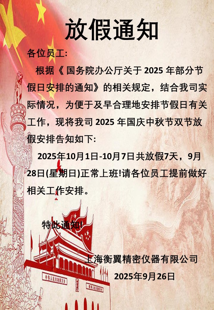衡翼儀器2025年中秋國慶節(jié)放假安排的通知